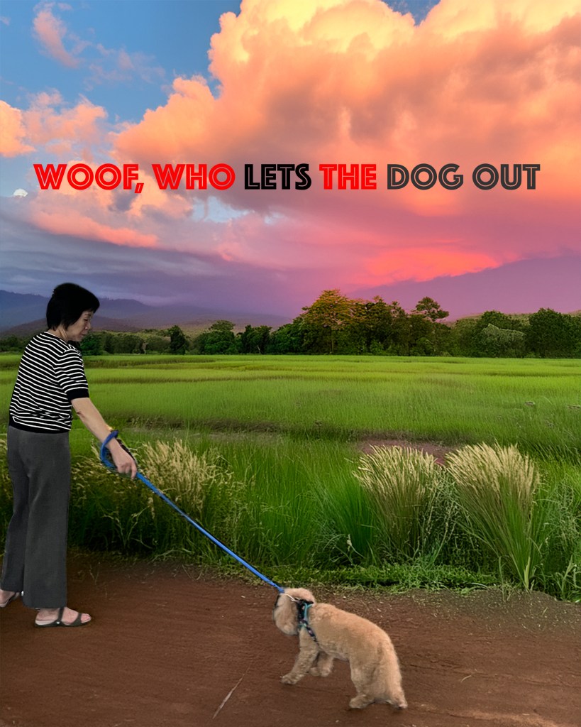 A new background featuring pink clouds and green fields was added to replace the original setting. This background was created using Generative AI in Photoshop to give the image a more imaginative and playful visual style.